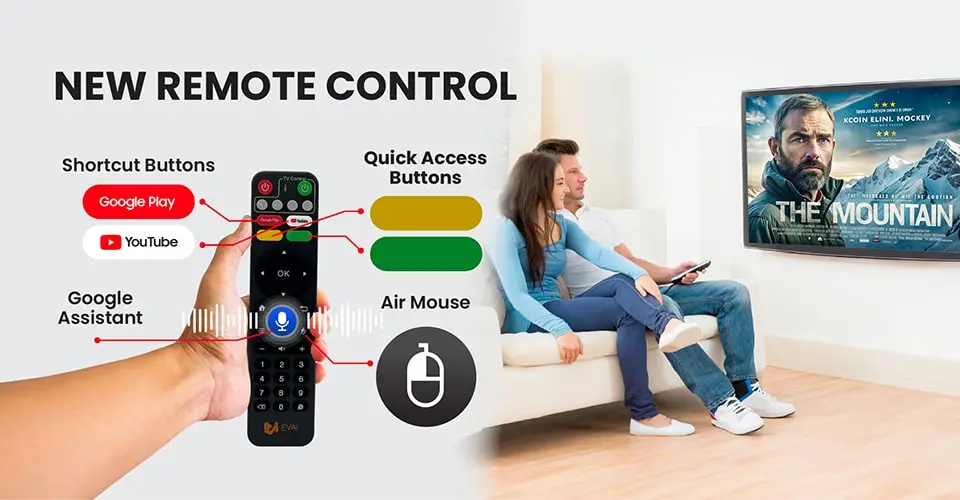 EVPAD 11S는 업그레이드된 스마트 리모컨과 Google Assistant를 탑재하여 더욱 부드럽고 직관적인 조작 경험을 제공합니다. 에어마우스 기능, 단축키, 커스텀 버튼을 통해 원하는 기능에 빠르게 접근할 수 있습니다. 음성 명령을 사용하면 검색, 볼륨 조절, 스마트 기기 제어까지 모두 손쉽게 가능합니다.