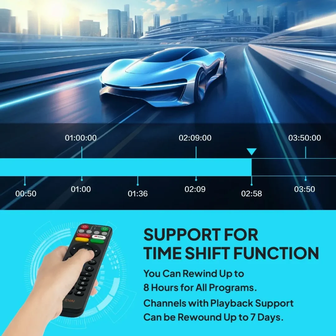EVPAD TV BOX는 혁신적인 타임시프트 기능으로 IPTV 업계의 새로운 기준을 제시합니다. 버튼 한 번으로 지난 8시간의 방송을 즉시 다시 볼 수 있으며, 일부 채널은 최대 7일간 다시보기 지원이 가능합니다. 중요한 순간을 놓치지 않고 원하는 시간에 편리하게 시청할 수 있습니다.